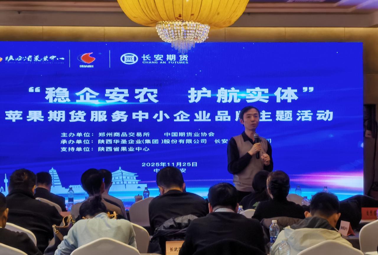 11月25日,由鄭州商品交易所與中國期貨業協會共同主辦,陜西華圣企業(集團)股份有限公司與長安期貨有限公司聯合承辦,陜西省果業中心支持協辦的“蘋果期貨服務中小企業”主題活動在西安圓滿舉辦?;顒右浴靶屡f果季蘋果市場形勢分析及期權助力產業風險管理”為主題,圍繞新舊果季蘋果市場的產銷形勢、期貨服務現貨企業經營等關鍵議題展開深入探討。陜西省果業中心副主任楊建偉出席活動并作主題分享,華圣農業集團孫亞飛、長安期貨副總經理郭蘇婭等嘉賓參加活動。在主題發言環節,楊主任全面總結了2024產季全國蘋果的產銷情況,指出多數客商存貨實現較高利潤。針對2025新季,他表示,陜西蘋果產量預計與上年基本持平,但整體質量水平有所下滑,同品質蘋果價格同比上漲至少1元/斤。面對當前庫存蘋果存在的質量風險,他呼吁企業增強風險意識,積極學習運用期貨工具,提升經營韌性與抗風險能力。華圣農業集團孫亞飛結合企業實際,分析了現貨經營中常見的自然災害等風險類型,并介紹了如何借助期貨市場進行有效風險對沖。長安期貨分析師范磊就蘋果期權基礎知識及套期保值原理作了專題講解,結合產業實際案例,深入淺出地闡述了企業如何利用期權工具開展套期保值,為產業客戶提供了專業可行的操作建議。在會議總結與交流環節,楊主任組織與會代表圍繞新果季產銷形勢展開深入研討。白水盛隆董事長侯保智分享稱,本果季企業收購量同比減少約一半,收購成本高企,導致套保交割缺乏利潤空間,因而未參與本年度的期貨交割。與會各方圍繞期貨工具的理解與應用展開熱烈討論,進一步增強了行業對期貨市場的認知與運用能力。本次活動通過政策解讀、形勢研判與實踐分享,為中小企業應對市場波動提供了系統指引。華圣農業集團作為連接期貨市場與實體產業的關鍵橋梁,將持續推動風險管理經驗普及與模式創新,為產業穩健發展注入持續動能,助力蘋果產業在金融賦能下實現高質量發展。