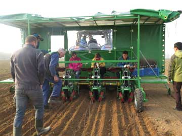 3月4-7日,在來(lái)自荷蘭的技術(shù)工程師Mr. HendrikusHol, H.S.S.B.V等一行4人來(lái)到寶雞華圣果業(yè)有限責(zé)任公司,對(duì)公司進(jìn)口的苗木種植機(jī)進(jìn)行了安裝調(diào)試和技術(shù)培訓(xùn)。 苗木種植機(jī)為國(guó)內(nèi)首次引進(jìn),是本次設(shè)備安裝調(diào)試培訓(xùn)的重點(diǎn)。主要由操作平臺(tái)、核心作業(yè)部件組成,其中核心作業(yè)部件可一次性完成種植過(guò)程中的開(kāi)溝、種植、覆土、壓實(shí)4道程序。具有操作簡(jiǎn)便、作業(yè)量大、作業(yè)質(zhì)量高等特點(diǎn)。作業(yè)人員只需坐在平臺(tái)的座椅上,就像插秧般,將手里的苗木放在不斷閉合的兩個(gè)滾動(dòng)輪的縫隙間,幾秒后,苗木就整齊地站立在了田間。該種植機(jī)作業(yè)時(shí)一個(gè)班組配備7名操作人員,每天可以種植蘋果砧木8萬(wàn)株,大約是當(dāng)?shù)厝斯しN植速度的10倍多。另外,設(shè)備自帶的照明裝置可以實(shí)現(xiàn)晚間正常工作。用該種植機(jī)定植的苗木具有橫成排、豎成列、均勻緊實(shí)、深淺一致的特點(diǎn),顯著提高了種植的整齊度和成活率,有利于苗圃后期機(jī)械除草、打藥、起苗等作業(yè)管理,為提高苗木出圃的商品性奠定了堅(jiān)實(shí)的基礎(chǔ)。 另外,公司引進(jìn)的1500升牽引式風(fēng)送噴霧機(jī)雙側(cè)噴幅可達(dá)近20米,每小時(shí)作業(yè)面積50-100畝。噴頭流量和噴幅都可以進(jìn)行調(diào)節(jié)。而與之配套的電子化控制的農(nóng)藥混合機(jī)大大縮短了噴藥前的準(zhǔn)備時(shí)間,有力地保障了植保機(jī)械化作業(yè)的效率。 經(jīng)過(guò)這幾天的設(shè)備安裝調(diào)試培訓(xùn)和現(xiàn)場(chǎng)演練,公司上下對(duì)農(nóng)業(yè)現(xiàn)代化和機(jī)械化有了更深刻的認(rèn)識(shí),同時(shí)對(duì)國(guó)外機(jī)械設(shè)備求實(shí)創(chuàng)新、精益求精以及人性化的設(shè)計(jì)制造理念有了直觀的體會(huì)。該批進(jìn)口果園機(jī)械的安裝調(diào)試工作的順利完成也標(biāo)志著華圣果業(yè)在發(fā)展現(xiàn)代化種植業(yè)過(guò)程中,在實(shí)現(xiàn)果園全程管理機(jī)械化方面邁出了堅(jiān)實(shí)的一步,如虎添翼,助力農(nóng)業(yè)規(guī)模化經(jīng)營(yíng)。