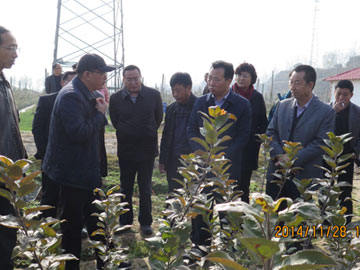 2014年12月23日,寶雞市市委副書記陳光明在千陽縣縣委書記郝晉升及縣長何玲的陪同下,視察了寶雞華圣果業有限責任公司崔家頭種植基地和柿溝苗木基地。公司副總經理史繼東向各位領導介紹了基地建設情況和公司未來發展規劃。參觀期間,苗圃正在進行冬季起苗,陳書記詢問了品種嫁接及苗木貯藏等有關情況,并就苗木未來發展與相關人員進行深入交流。在參觀種植基地時,給予了充分肯定。 華圣果業崔家頭蘋果種植基地一期建設征地3000畝,選用進口大苗建園,從歐洲引進果園專用拖拉機、風送彌霧機等機械設備,配備遠程遙控、檢測、測報設備,實現機械化、自動化、標準化。柿溝苗木基地一期征地2000畝,先后建立了砧木原種圃、砧木壓條繁育圃、種質資源圃、品種采穗圃、大苗繁育圃、品種展示園、組培脫毒快繁試驗區等。引進了歐洲AA級大苗培育標準和生產操作規程,嚴格按照該標準生產無病毒、自根砧分枝大苗,保證苗木生產質量。