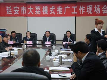 2013年10月30日至31日,“延安大荔模式觀摩暨推廣工作現場會”在富縣延安華圣三農科技服務公司舉行。此次會議由延安市科技局組織,參會人員包括延安市科技局黨組書記、局長劉寶霖,局黨組副書記、副局長白建宏,富縣政府副縣長王冬梅,延安市科技局副調研員馬潤波,富縣科技局局長周立群,陜西華圣果業副總經理佘均安,宜川荔民農資連鎖運營中心經理張文科以及延安市財政局、農業局、林業局、畜牧局等相關部門的負責人、各縣區科技局局長、“大荔模式”推廣企業負責人等。 30日下午15時,由白建宏帶隊在延安華圣三農科技服務公司“大荔模式”推廣縣級總站,鄉級總站及村級總站觀摩并召開現場會,觀摩現場人頭攢動。三農公司副總經理張林做了公司“大荔模式”推廣工作整體匯報,具體介紹了“六縣一區”業務的覆蓋范圍、流程以及操作規范,取得的重大成績。并針對目前華圣“大荔模式“實施情況所需要的技術支撐提出了建議。 31日上午8時30分,在富縣賓館舉行了“延安大荔模式推廣”工作會。會上王冬梅副縣長致詞,歡迎各位領導及嘉賓參加此次會議,并預祝大會圓滿成功。馬潤波副調研員宣讀《延安市科學技術局關于加快農技服務大荔模式推廣工作的意見》。富縣科技局局長周立群、陜西華圣果業副總佘均安、宜川荔民農資連鎖運營中心經理張文科分別交流推廣大荔模式工作經驗。最后,由劉寶霖局長總結過去推廣工作,分析了推廣工作中存在的問題和不足,全面詳細地安排了全市大荔模式推廣工作和農村科技服務體系建設工作。會議中劉寶霖局長高度評價及肯定了華圣三農公司推廣大荔模式工作及在延安所取得的成績。