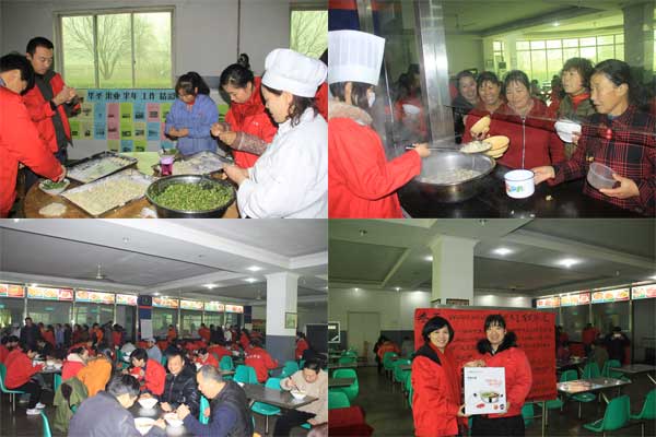 2013年12月22日是傳統節氣——冬至,為了讓大家吃到可口的水餃,餐廳師傅們利用業余時間提前20天包制了各種各樣的水餃。冬至前兩天,午餐時間,員工們吃上了熱氣騰騰的餃子, 為了活躍員工就餐氣氛,在吃餃子的同時,把15個象征著幸運的“開口杏”分別包制在十五個水餃中,十五名吃到包有開口杏水餃的員工幸運中獎,他們興高采烈地領到一個不銹鋼鴛鴦火鍋。