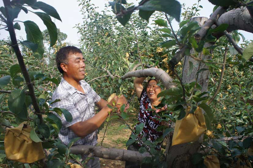 勤快,就是不嫌麻煩,不怕吃苦,一份耕耘一份收獲。周玖林說,他和妻子一年四季除了吃飯睡覺,基本都在果園里忙活。春季上肥、拉枝、疏花定果、套袋,夏季剪枝、追肥、摘心扭梢,秋季涂干防腐爛、除袋、鋪反光膜、摘蘋果,冬季又要剪枝、清園等,只要你肯干,果園里有的是活。最忙的時候,他們夫妻二人凌晨4點多就進園子,忙到天黑還歇不下。周玖林說,根據華圣三農公司技術老師的建議,今年春季給果樹拉枝,夫妻倆給自己定了個目標,一天拉600條枝,20多天下來,他們一共拉了15000多條枝。按每條枝結3個蘋果算,能帶來四、五塊錢的收入,15000條枝就能增加六、七萬元的收入。如果懶一懶不去做,那就沒有這些錢掙了。