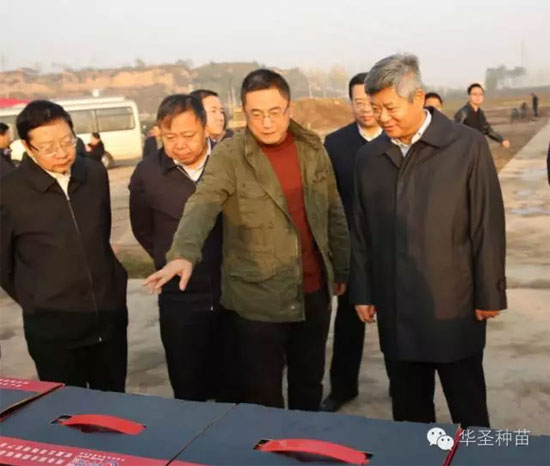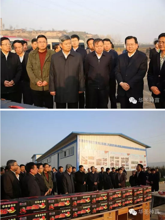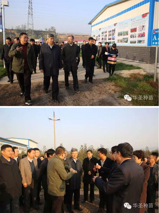 11月13日,省委常委、延安市委書記徐新榮一行60余人在寶雞市副市長王寧剛的陪同下到華圣千陽苗木繁育基地參觀調研。