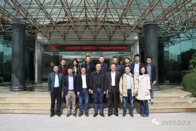 2018年3月27日,京東集團副總裁、京東西北區域總經理孫桂宇等一行六人蒞臨華圣果業參觀座談。在華圣果業總經理孫曉冰等人員的陪同下,參觀了華圣果業先進的氣調保鮮庫、果品自動分選線、包裝及成品展示區。 詳細了解了公司發展歷程、業務布局及未來規劃。